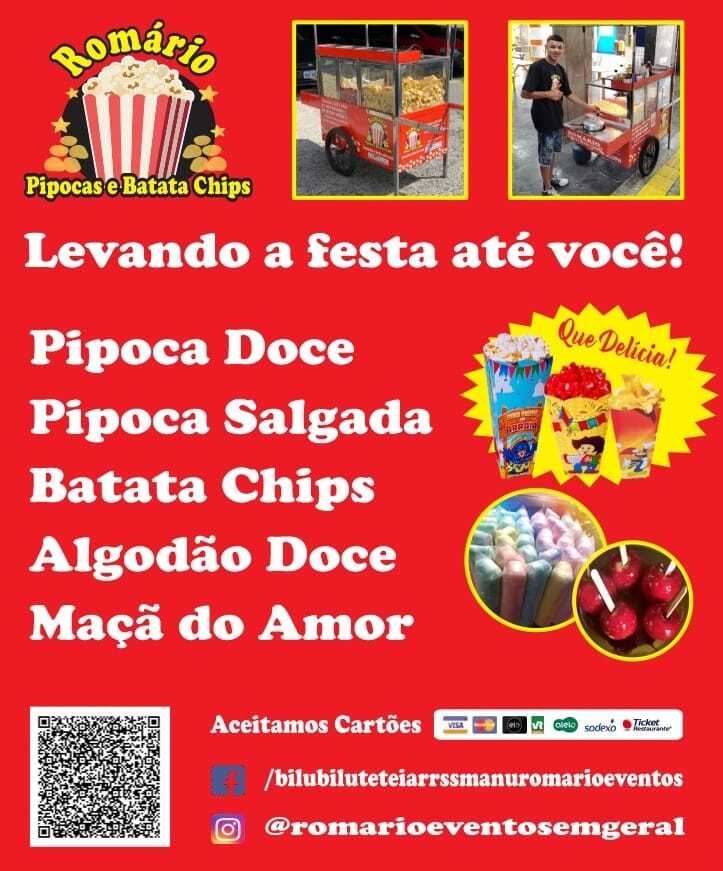 Nós trabalhamos com todos os tipos de eventos e festas, nosso objetivo é levar alegria, pipoca e muita diversão ao eventos!😁